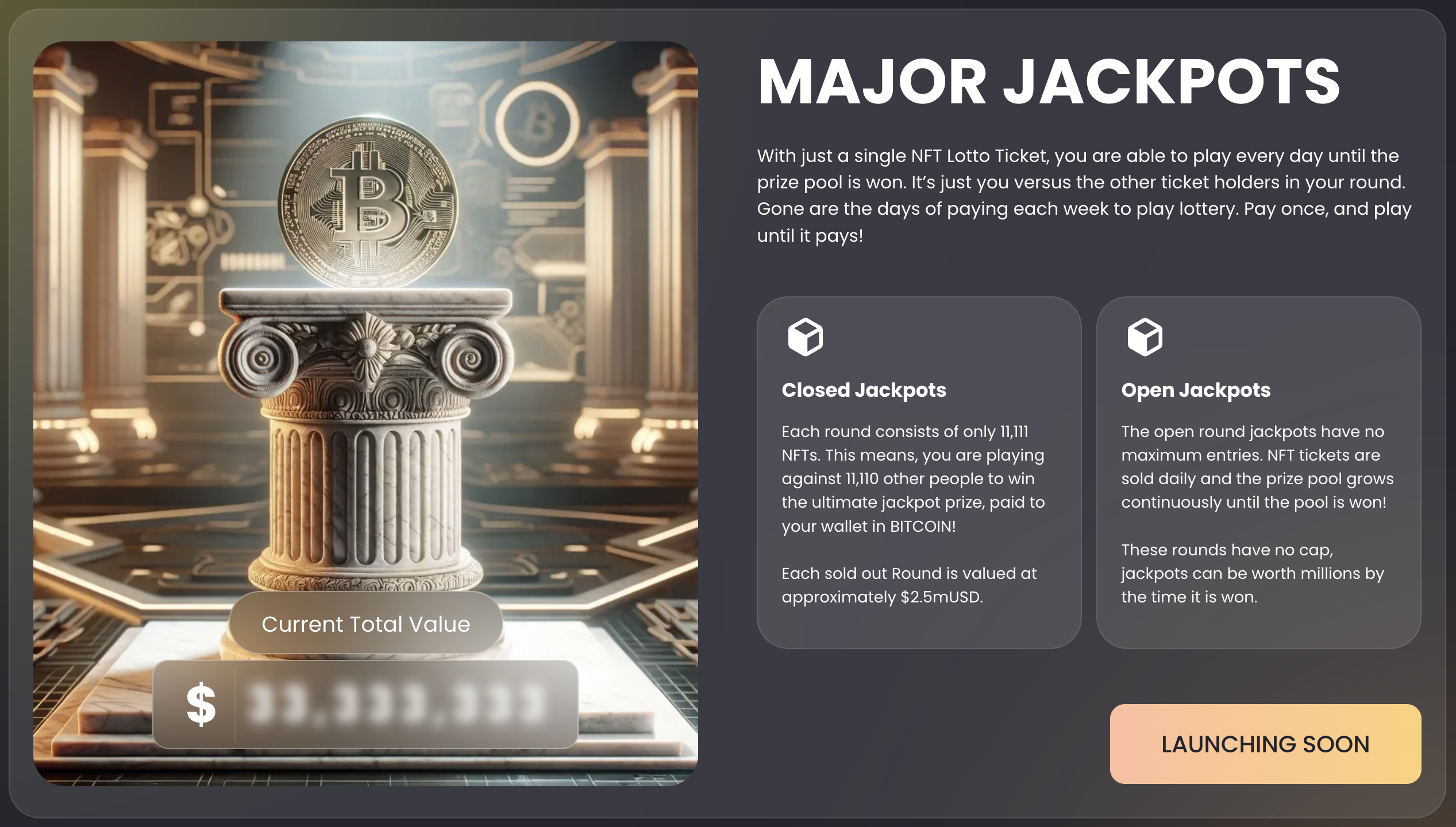 * **Closed Rounds:** With a Major Jackpot NFT ticket, you gain exclusive access to 'closed' rounds, where participation is limited to 11,111 holders. This significantly boosts your odds of winning by restricting the number of competitors.